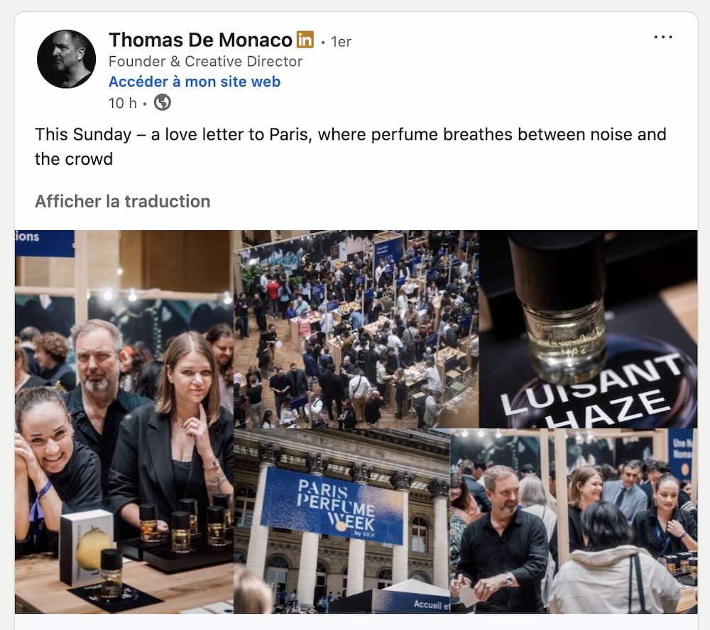 Au détour d’une notification LinkedIn, nous avons découvert le billet rédigé par Thomas de Monaco, fondateur éponyme de la marque de parfum. À peine remis de l’effervescence de la Paris Perfume Week, il a voulu partager ses impressions d’un salon animé, parfois à l’étroit, avec ses charmes et ses défauts, mais doté de la plus grande des qualités sans doute : être un salon parisien ! Touchés par son texte, nous avons demandé à Thomas si nous pouvions le publier sur notre site. Ce à quoi il a immédiatement répondu » Sorry for the bad words! ». Nous les avons trouvés justes, au contraire.
